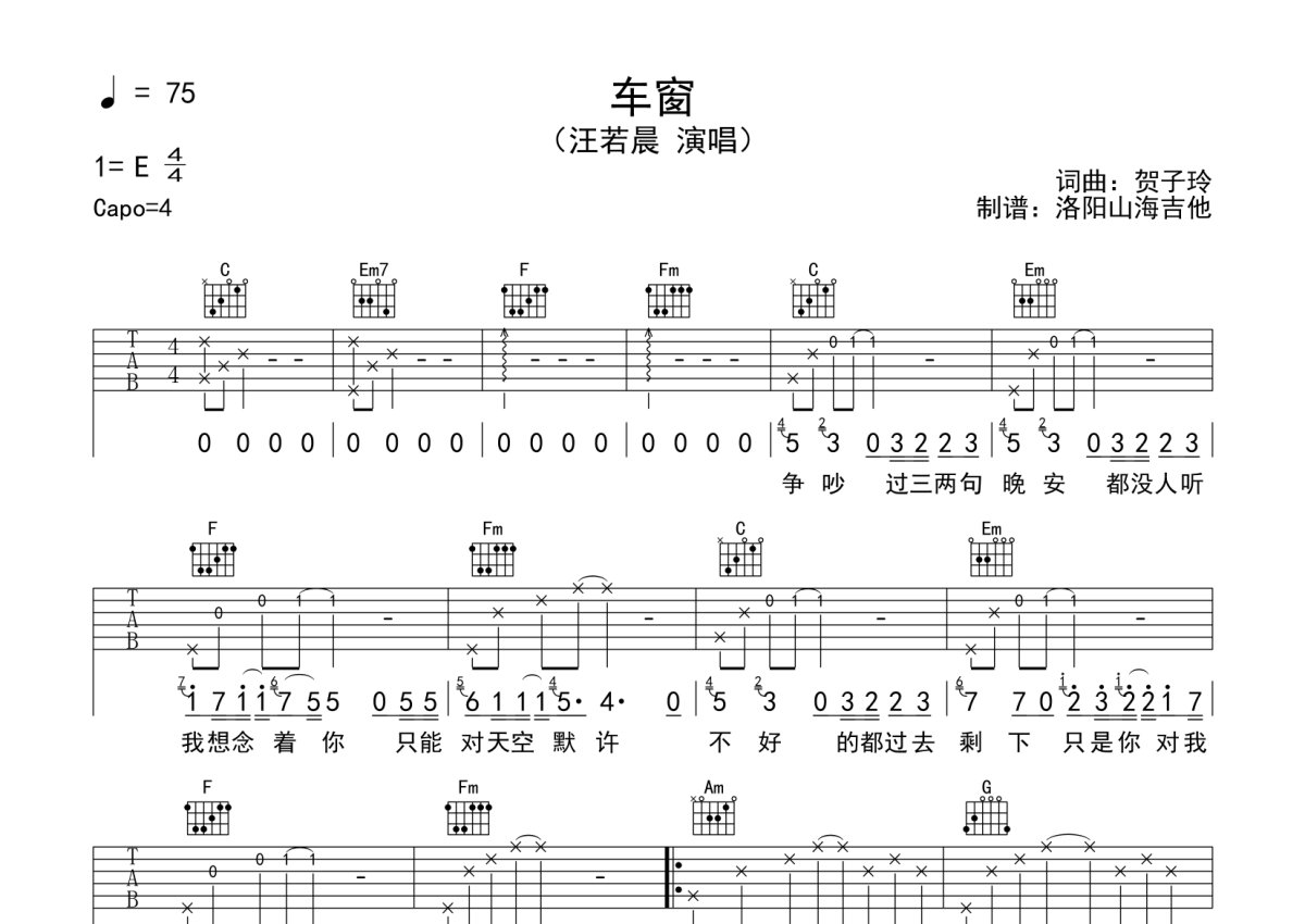 汪若晨《车窗》吉他谱 - C调弹唱六线谱