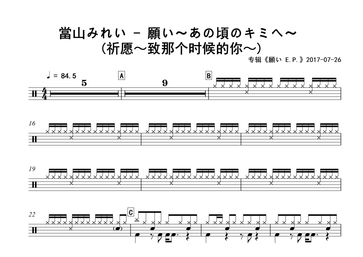 當山みれい《願い〜あの頃のキミへ〜 (祈愿~致那个时候的你~)》架子鼓谱 - 专辑版