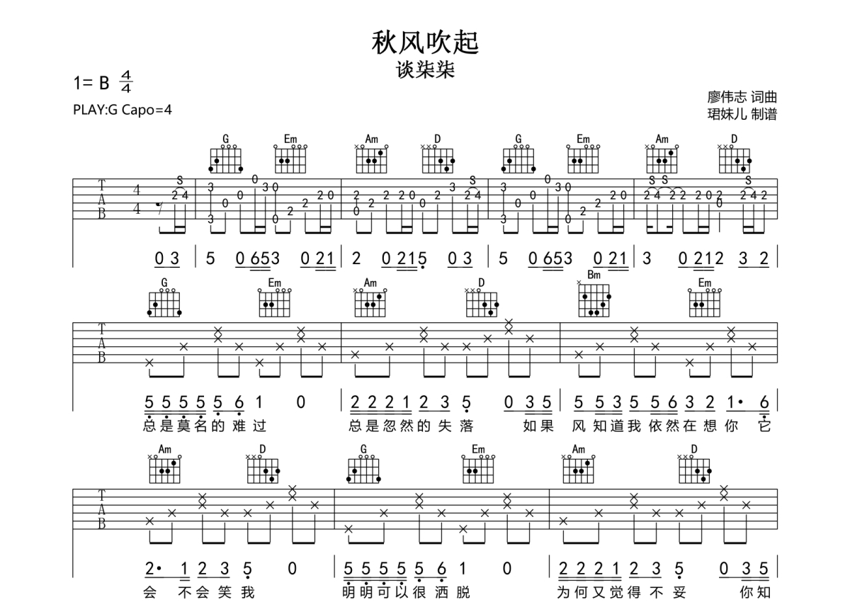 《秋风吹起》吉他谱 - 谈柒柒 - G调弹唱六线谱