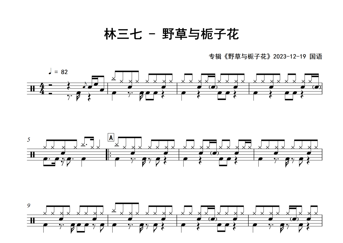 林三七《野草与栀子花》架子鼓谱 - 专辑版