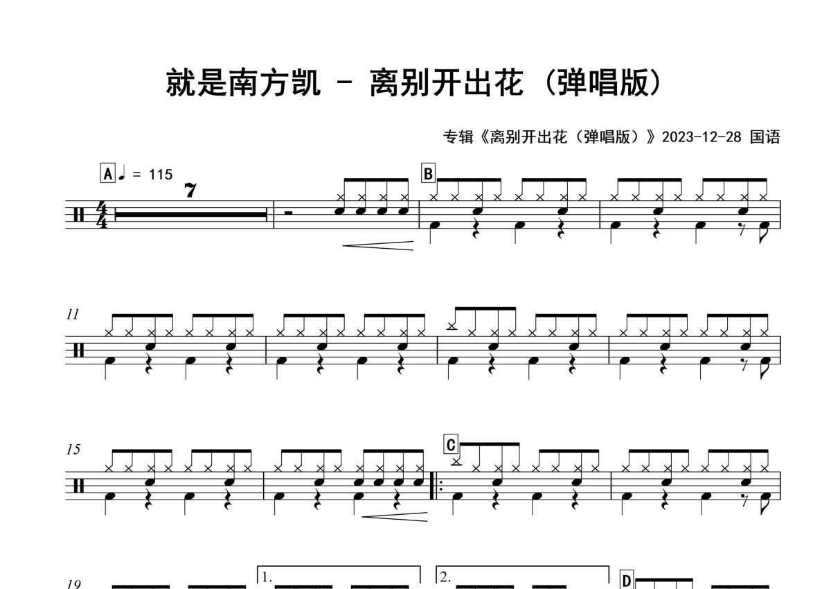 就是南方凯《离别开出花 (弹唱版)》架子鼓谱 - 专辑版
