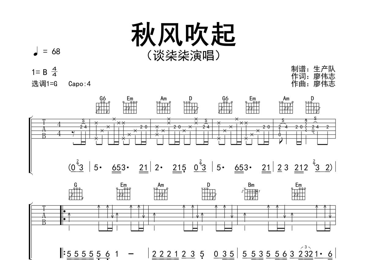 《秋风吹起》是谈柒柒演唱的一首歌曲,精编完美版,拍号为4/4拍,歌曲速度为每分钟68拍,歌曲原调为B调,但由于原调指法比较难,为了方便弹奏,本吉他谱采用的是G调指法编配,变调夹4品弹奏即为原调,当然也可以根据自己的音域改变变调夹位置,或者通过改变和弦调性,以方便自己弹奏,这份吉他谱共有三张高清图谱,图谱由 @生产队 编配上传,图谱使用六线谱编配,包含吉他和弦指法、简谱以及歌词部分,使用这份秋风吹起吉他谱,可以让你更加方便地掌握这首歌曲的弹唱技巧,快来尝试吧。谈柒柒演唱的热门民谣歌曲《秋风吹起》原版吉他谱,完整的前奏、间奏、尾奏solo编配。