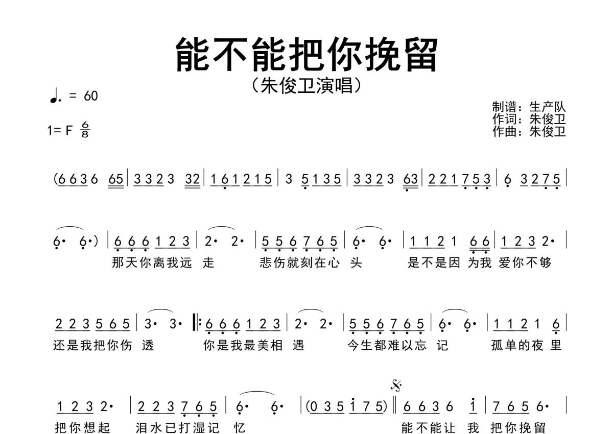 《能不能把你挽留》是朱俊卫演唱的一首歌曲,原版简谱,拍号为6/8拍,歌曲速度为每分钟60拍,这份简谱共有一张高清图谱,图谱由 @生产队 编配上传朱俊卫创作并演唱的歌曲《能不能把你挽留》原版简谱,精准的前奏、间奏、尾奏solo编配。