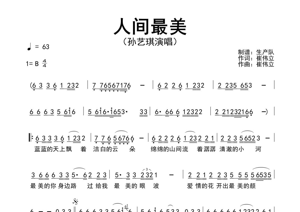 《人间最美》是孙艺琪演唱的一首歌曲,原版简谱,拍号为4/4拍,歌曲速度为每分钟63拍,这份简谱共有一张高清图谱,图谱由 @生产队 编配上传孙艺琪演唱的歌曲《人间最美》原版简谱,精准的前奏、间奏、尾奏solo编配。