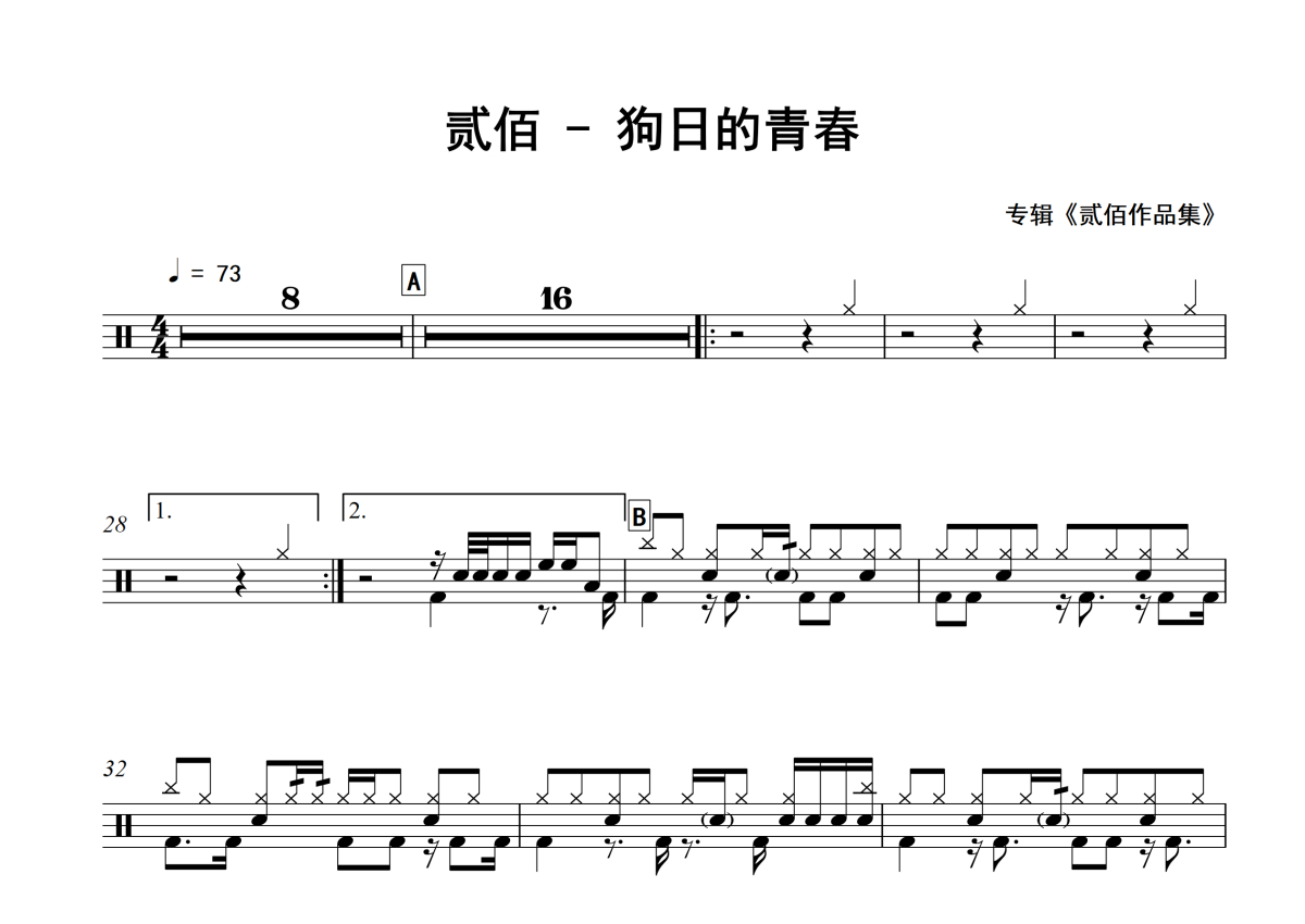 贰佰《狗日的青春》架子鼓谱 - 专辑版