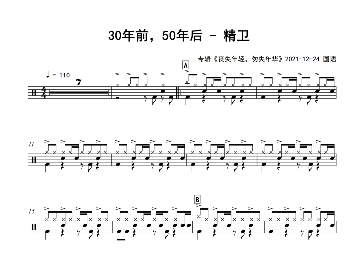 《精卫》是30年前,50年后演唱的一首歌曲,专辑版,拍号为4/4拍,歌曲速度为每分钟110拍,这份架子鼓谱共有两张高清图谱,图谱由 @积极处世 编配上传,图谱使用五线谱编配,使用这份精卫架子鼓谱,你将能够轻松地敲打出这首30年前,50年后的精卫,快来尝试吧。