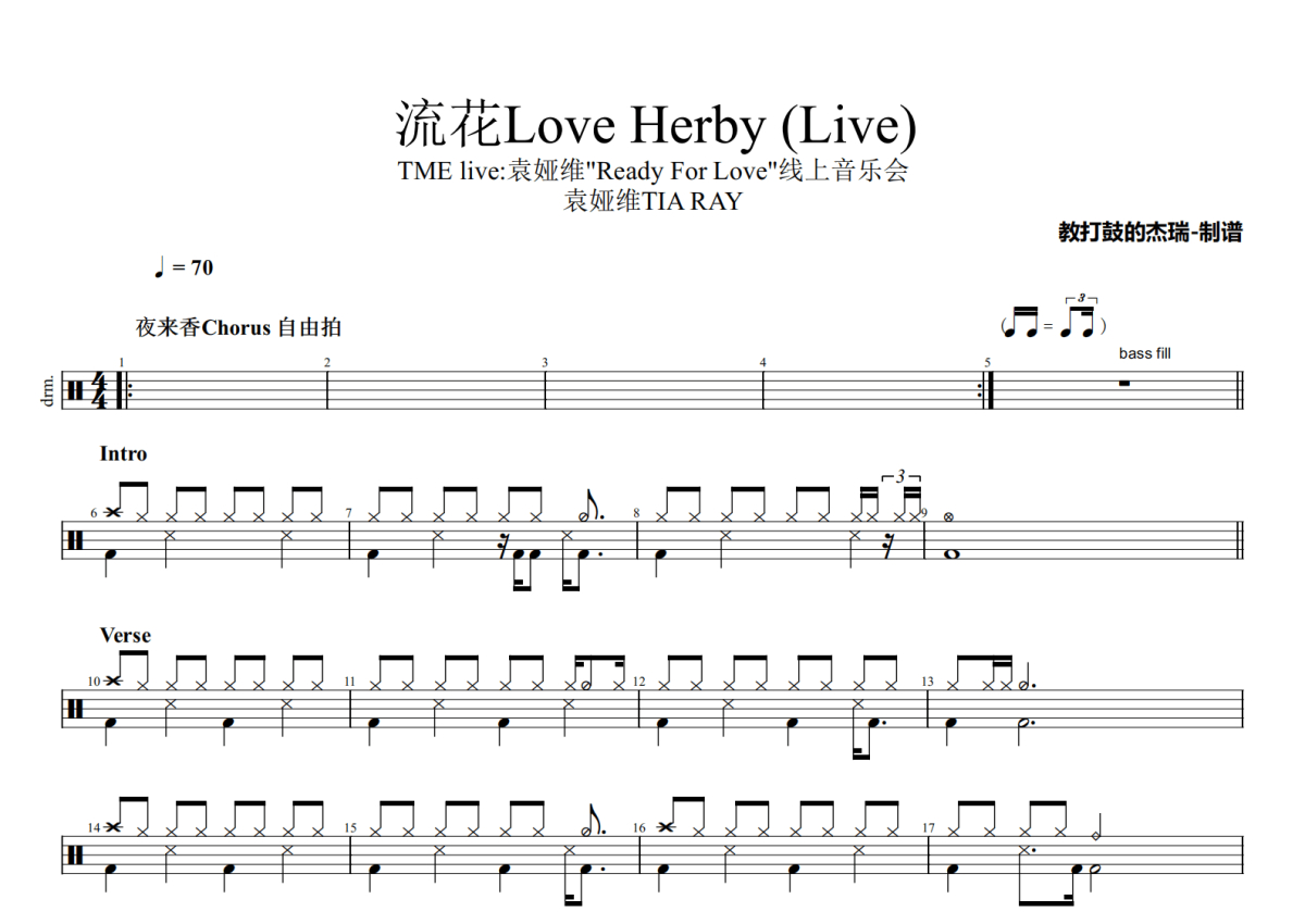 《流花Love Herby (Live)》是袁娅维TIA RAY演唱的一首歌曲,TME live:袁娅维"Ready For Love"线上音乐会,拍号为4/4拍,歌曲速度为每分钟70拍,这份架子鼓谱共有两张高清图谱,图谱由 @Jerry 编配上传,图谱使用五线谱编配,使用这份流花Love Herby (Live)架子鼓谱,你将能够轻松地敲打出这首袁娅维TIA RAY的流花Love Herby (Live),快来尝试吧。