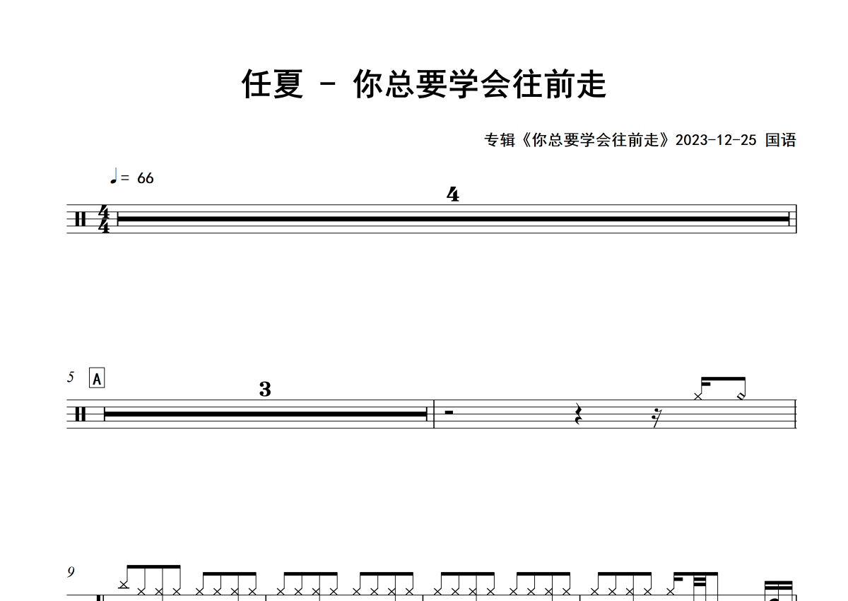 《你总要学会往前走》是任夏演唱的一首歌曲,专辑版,拍号为4/4拍,歌曲速度为每分钟66拍,这份架子鼓谱共有两张高清图谱,图谱由 @举个例子 编配上传,图谱使用五线谱编配,使用这份你总要学会往前走架子鼓谱,你将能够轻松地敲打出这首任夏的你总要学会往前走,快来尝试吧。