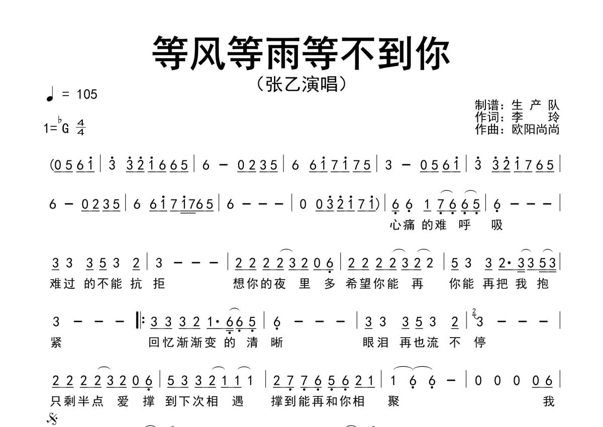 《等风等雨等不到你》是张乙演唱的一首歌曲,原版简谱,拍号为4/4拍,歌曲速度为每分钟105拍,这份简谱共有一张高清图谱,图谱由 @生产队 编配上传张乙演唱的歌曲《等风等雨等不到你》原版简谱,精准的前奏、间奏、尾奏solo编配。