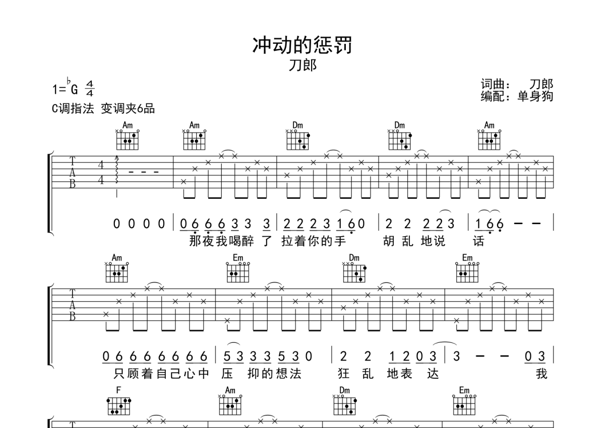 《冲动的惩罚》是刀郎演唱的一首歌曲,拍号为4/4拍,歌曲原调为Gb调,但由于原调指法比较难,为了方便弹奏,本吉他谱采用的是C调指法编配,变调夹6品弹奏即为原调,当然也可以根据自己的音域改变变调夹位置,或者通过改变和弦调性,以方便自己弹奏,这份吉他谱共有六张高清图谱,图谱由 @单身狗 编配上传,图谱使用六线谱编配,包含吉他和弦指法、简谱以及歌词部分,使用这份冲动的惩罚吉他谱,可以让你更加方便地掌握这首歌曲的弹唱技巧,快来尝试吧。