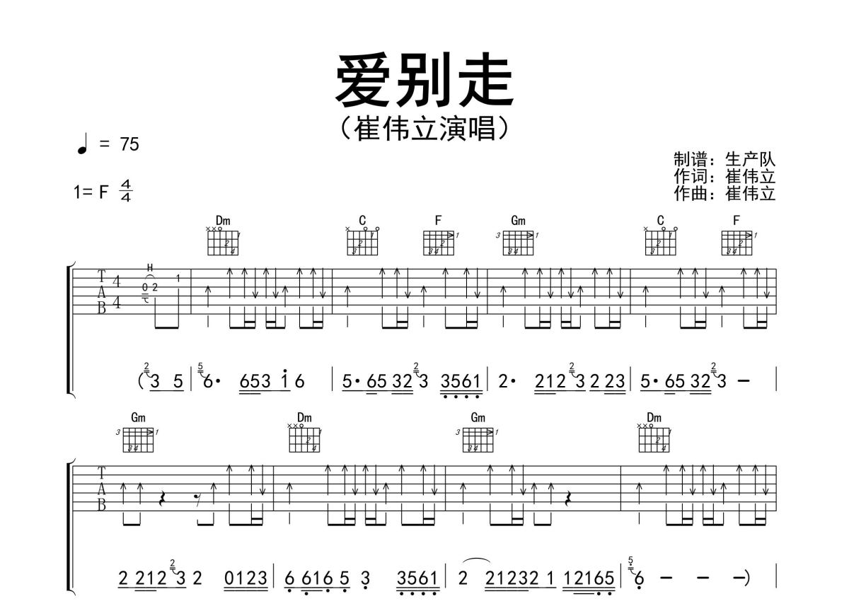 《爱别走》是崔伟立演唱的一首歌曲,精编完美版,拍号为4/4拍,歌曲速度为每分钟75拍,歌曲原调为F调,但由于原调指法比较难,为了方便弹奏,本吉他谱采用的是F调指法编配,演奏时不需要使用变调夹即为原调,这份吉他谱共有三张高清图谱,图谱由 @生产队 编配上传,图谱使用六线谱编配,包含吉他和弦指法、简谱以及歌词部分,使用这份爱别走吉他谱,可以让你更加方便地掌握这首歌曲的弹唱技巧,快来尝试吧。崔伟立演唱的歌曲《爱别走》原版吉他谱,精准的前奏、间奏、尾奏solo编配。