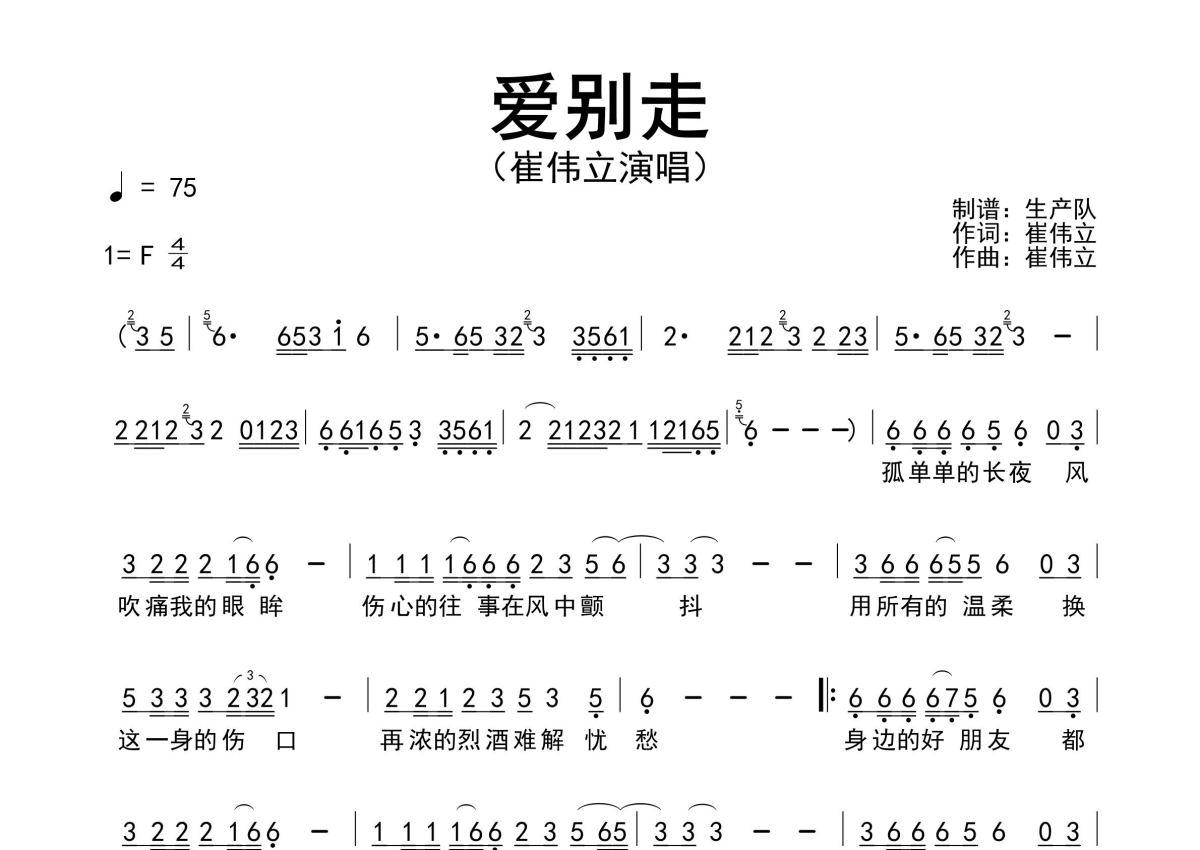 《爱别走》是崔伟立演唱的一首歌曲,原版简谱,拍号为4/4拍,歌曲速度为每分钟75拍,这份简谱共有一张高清图谱,图谱由 @生产队 编配上传崔伟立演唱的歌曲《爱别走》原版简谱,精准的前奏、间奏、尾奏solo编配。