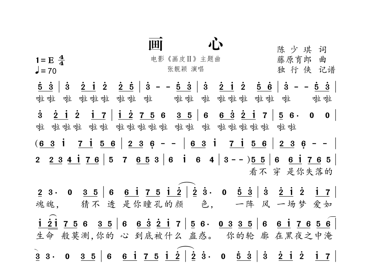 《画心》是张靓颖演唱的一首歌曲,拍号为4/4拍,歌曲速度为每分钟70拍,这份简谱共有两张高清图谱,图谱由 @独行侠 编配上传。