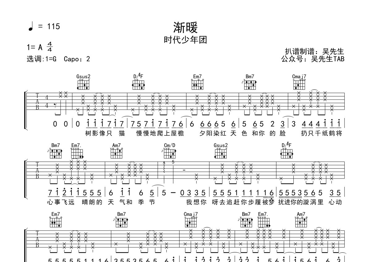 《渐暖》是时代少年团演唱的一首歌曲,本吉他谱采用的是G调指法编配,这份吉他谱共有两张高清图谱,图谱由 @吴先生TAB 编配上传,图谱使用六线谱编配,包含吉他和弦指法、简谱以及歌词部分,使用这份渐暖吉他谱,可以让你更加方便地掌握这首歌曲的弹唱技巧,快来尝试吧。时代少年团《渐暖》吉他弹唱谱,采用C调指法编配,吴先生TAB编配出品,共有2张高清图谱,免翻页排版设计。