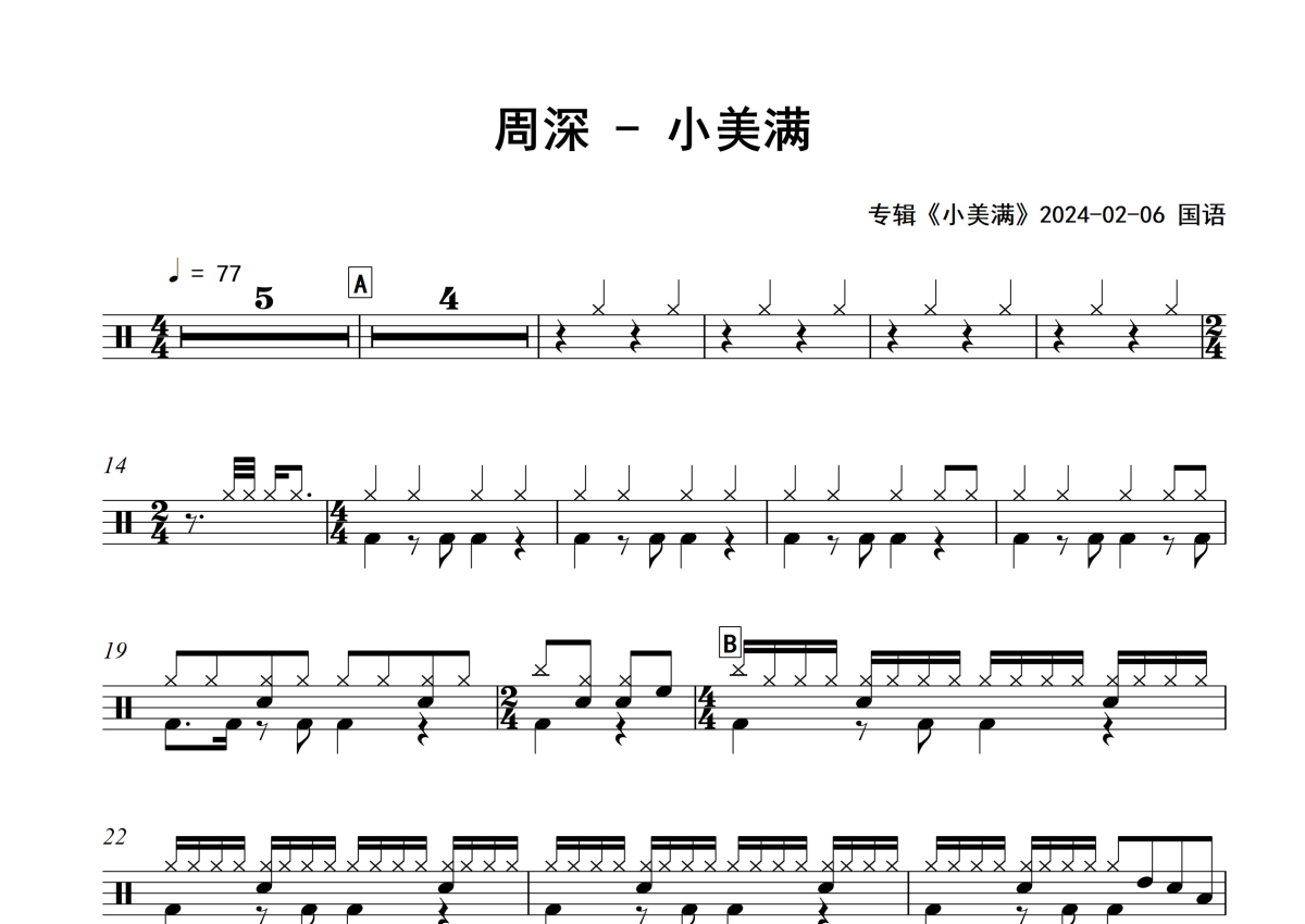 《小美满》是周深演唱的一首歌曲,专辑版,拍号为4/4拍,歌曲速度为每分钟77拍,这份架子鼓谱共有两张高清图谱,图谱由 @Sawubona 编配上传,图谱使用五线谱编配,使用这份小美满架子鼓谱,你将能够轻松地敲打出这首周深的小美满,快来尝试吧。