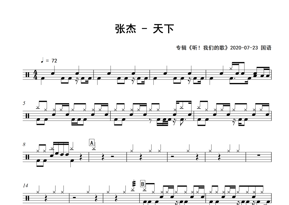 《天下》是张杰演唱的一首歌曲,专辑版,拍号为4/4拍,歌曲速度为每分钟72拍,这份架子鼓谱共有两张高清图谱,图谱由 @积极处世 编配上传,图谱使用五线谱编配,使用这份天下架子鼓谱,你将能够轻松地敲打出这首张杰的天下,快来尝试吧。