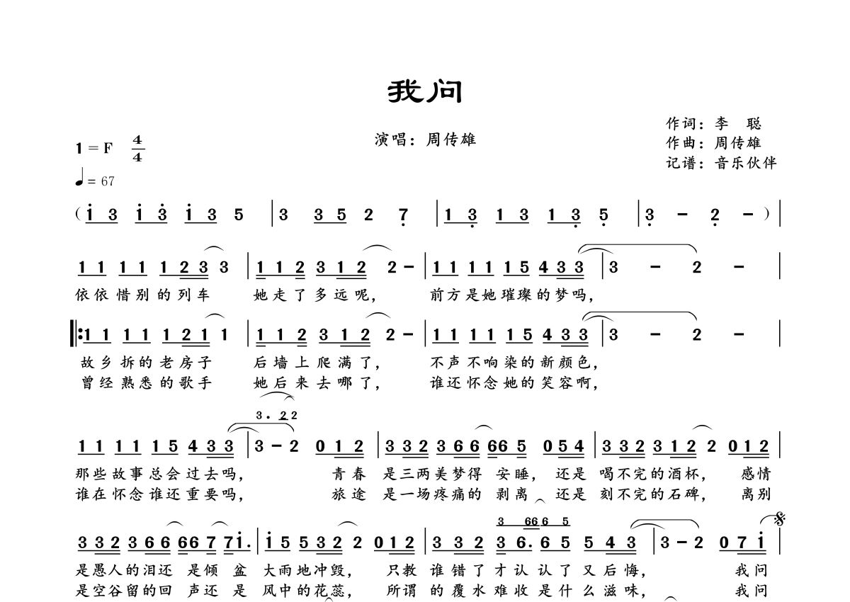 《我问》是周传雄演唱的一首歌曲,拍号为4/4拍,歌曲速度为每分钟67拍,这份简谱共有一张高清图谱,图谱由 @音乐伙伴 编配上传。
