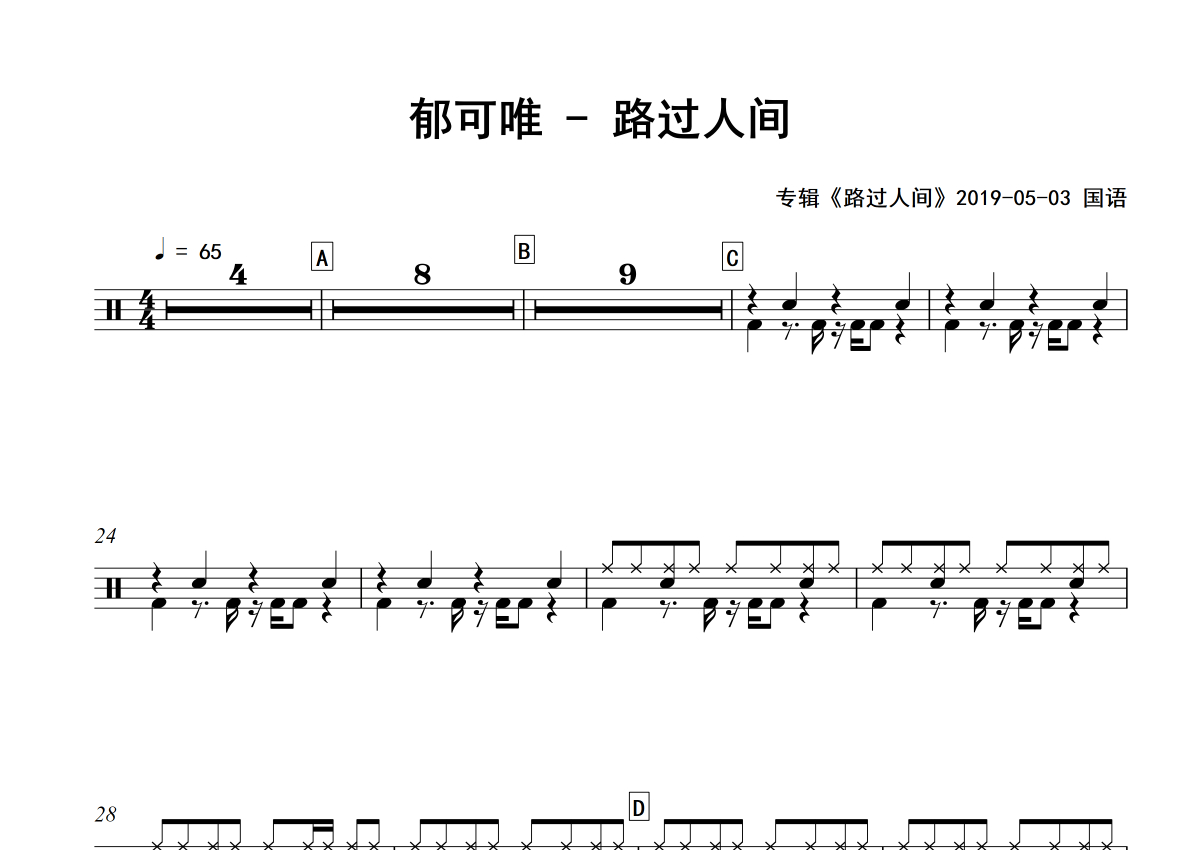 郁可唯《路过人间》架子鼓谱 - 专辑版