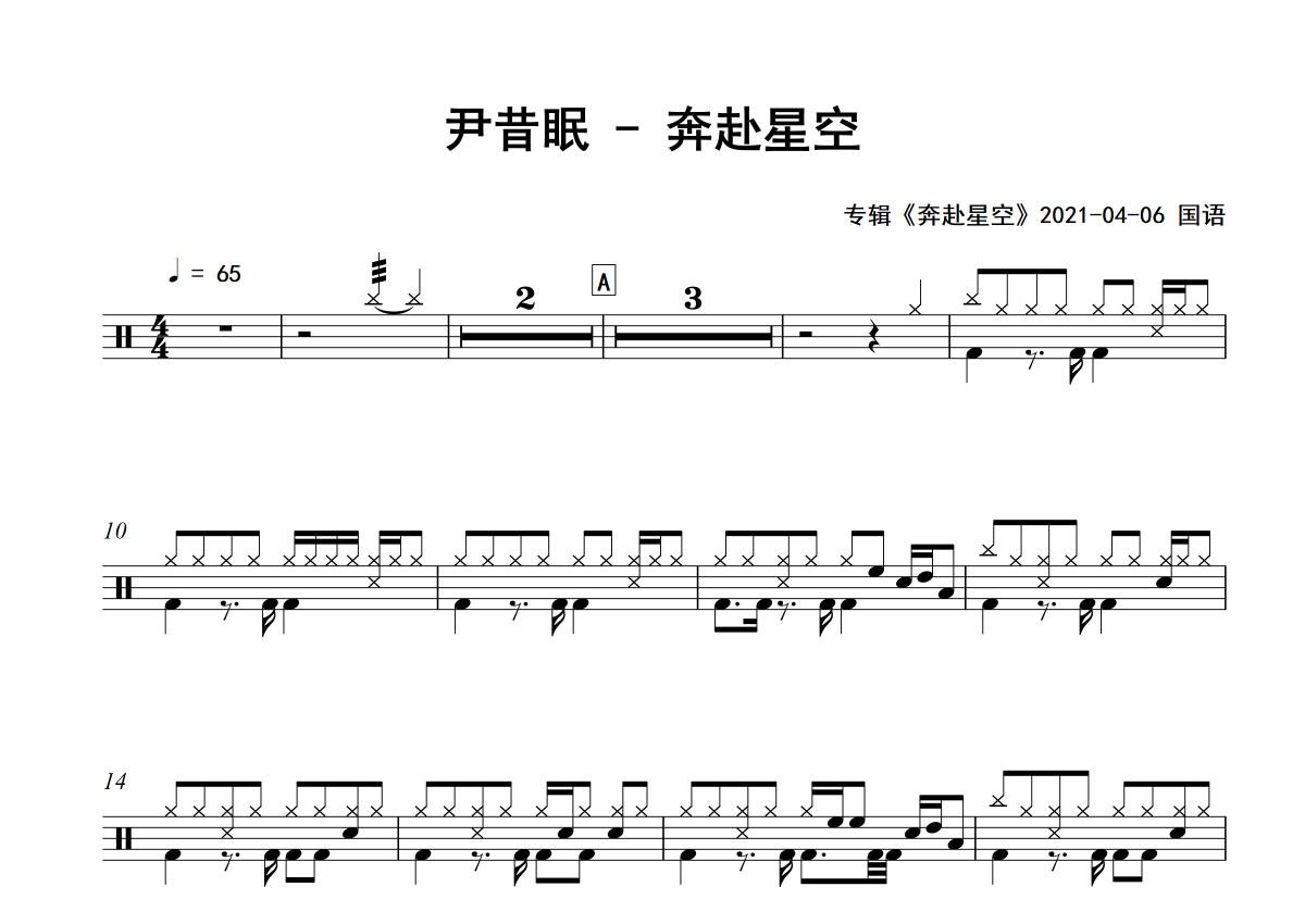 《奔赴星空》是尹昔眠演唱的一首歌曲,专辑版,拍号为4/4拍,歌曲速度为每分钟65拍,这份架子鼓谱共有两张高清图谱,图谱由 @举个例子 编配上传,图谱使用五线谱编配,使用这份奔赴星空架子鼓谱,你将能够轻松地敲打出这首尹昔眠的奔赴星空,快来尝试吧。