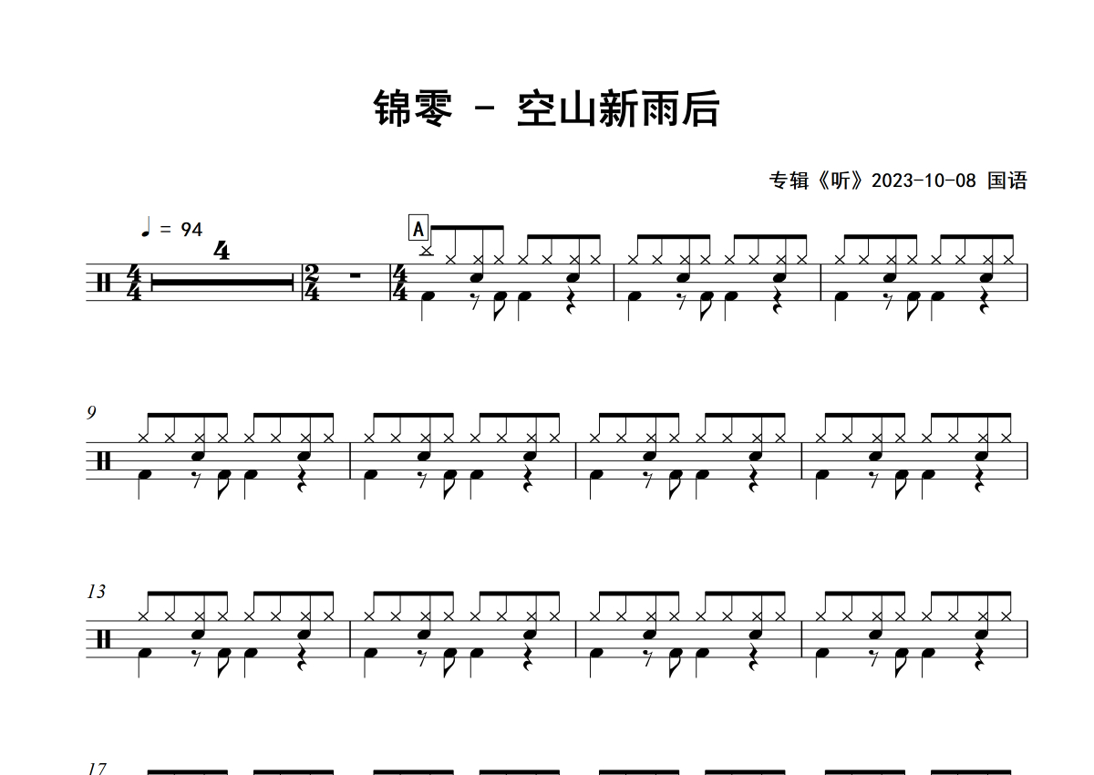 锦零《空山新雨后》架子鼓谱 - 专辑版