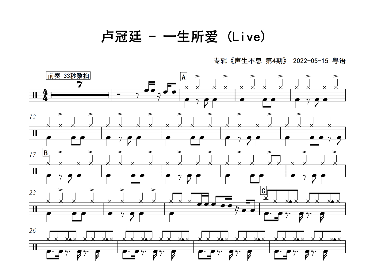 卢冠廷《一生所爱 (Live)》架子鼓谱 - 专辑版