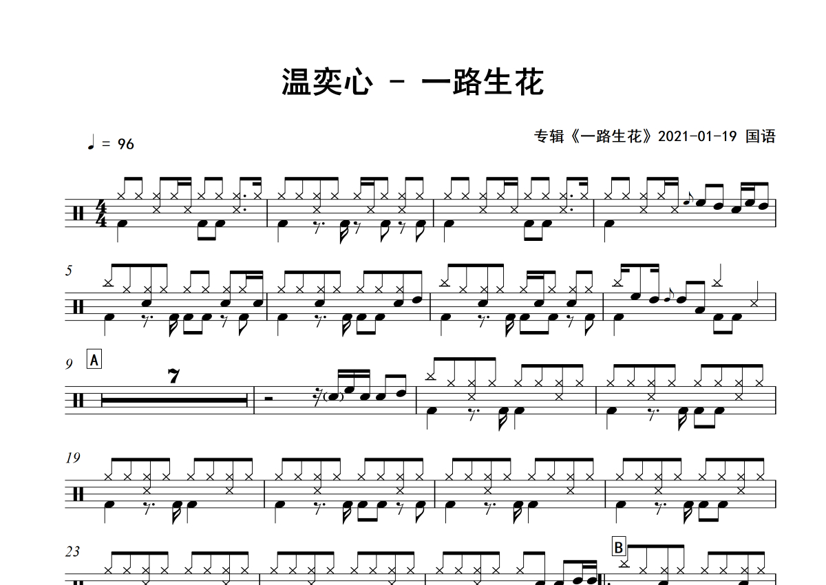 《一路生花》是温奕心演唱的一首歌曲,专辑版,拍号为4/4拍,歌曲速度为每分钟96拍,这份架子鼓谱共有两张高清图谱,图谱由 @Sawubona 编配上传,图谱使用五线谱编配,使用这份一路生花架子鼓谱,你将能够轻松地敲打出这首温奕心的一路生花,快来尝试吧。