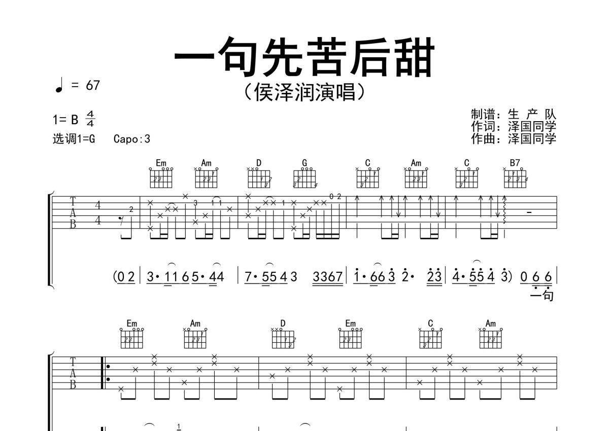 《一句先苦后甜》是侯泽润演唱的一首歌曲,精编完美版,拍号为4/4拍,歌曲速度为每分钟67拍,歌曲原调为B调,但由于原调指法比较难,为了方便弹奏,本吉他谱采用的是G调指法编配,变调夹4品弹奏即为原调,当然也可以根据自己的音域改变变调夹位置,或者通过改变和弦调性,以方便自己弹奏,这份吉他谱共有三张高清图谱,图谱由 @生产队 编配上传,图谱使用六线谱编配,包含吉他和弦指法、简谱以及歌词部分,使用这份一句先苦后甜吉他谱,可以让你更加方便地掌握这首歌曲的弹唱技巧,快来尝试吧。侯泽润演唱的歌曲《一句先苦后甜》原版吉他谱,完整的前奏、间奏、尾奏solo编配。