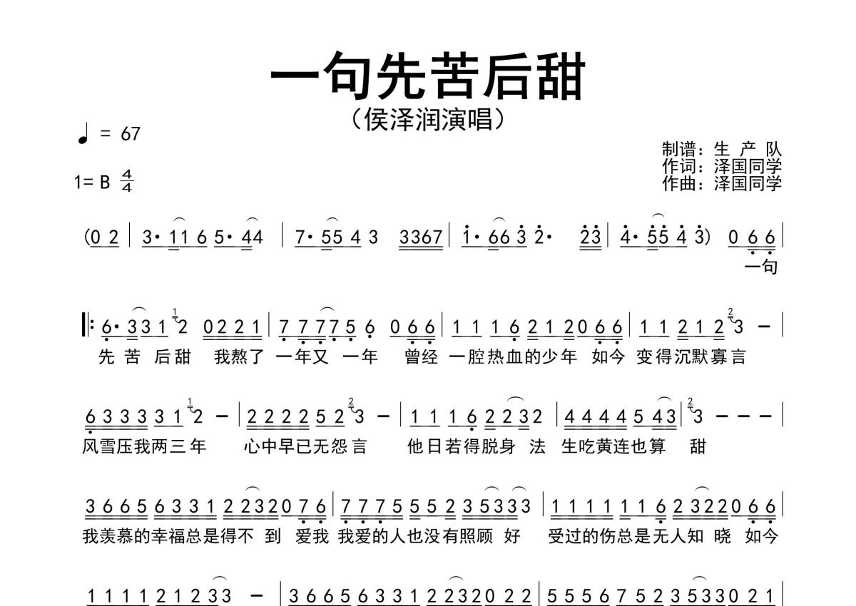 侯泽润《一句先苦后甜》简谱 - 原版简谱