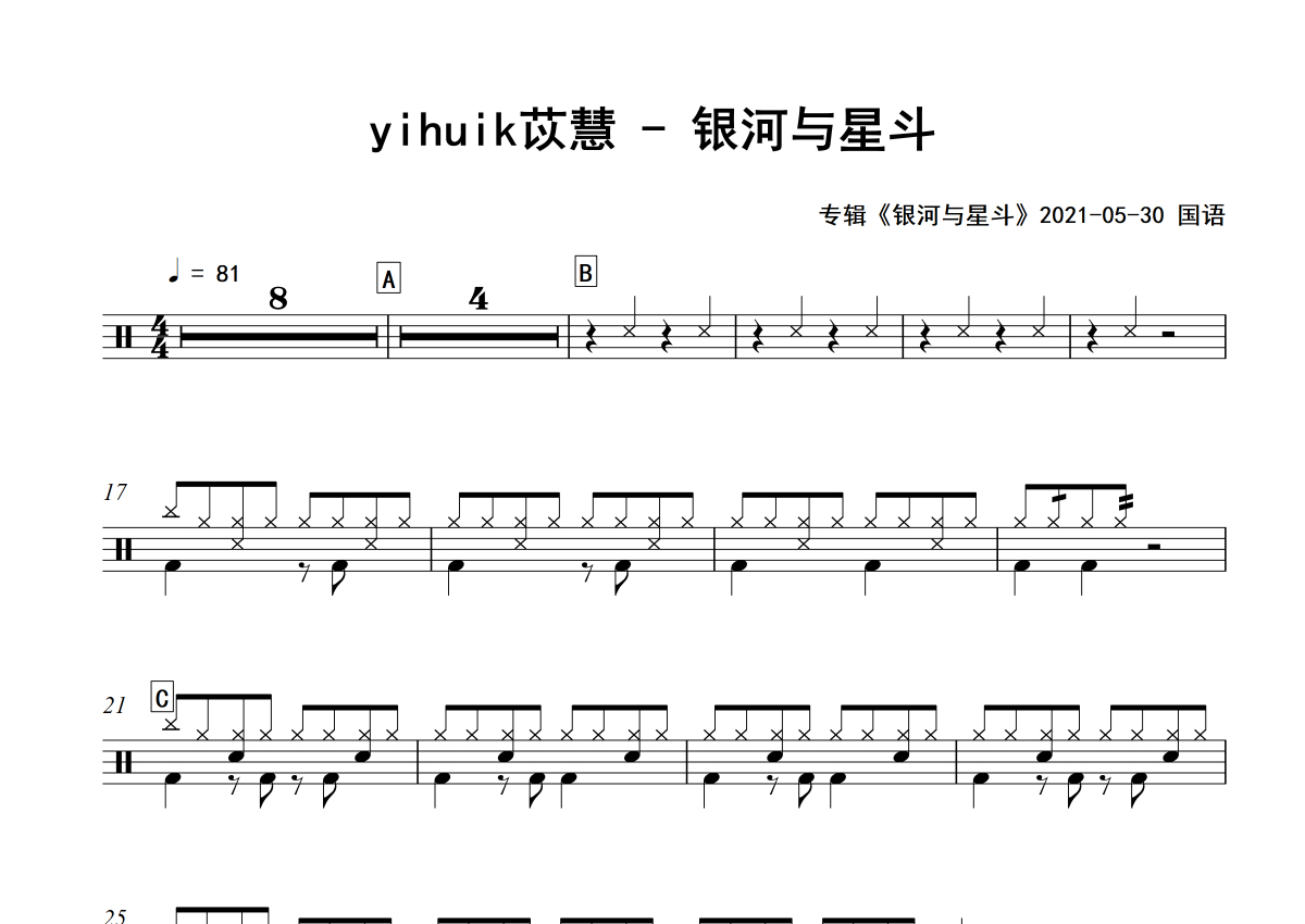 yihuik苡慧《银河与星斗》架子鼓谱 - 专辑版