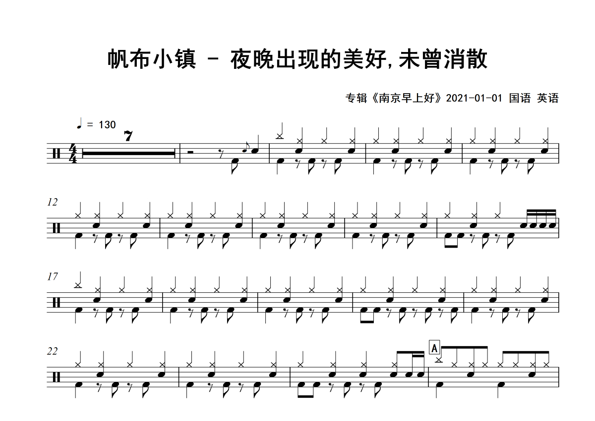 帆布小镇《夜晚出现的美好,未曾消散》架子鼓谱 - 专辑版