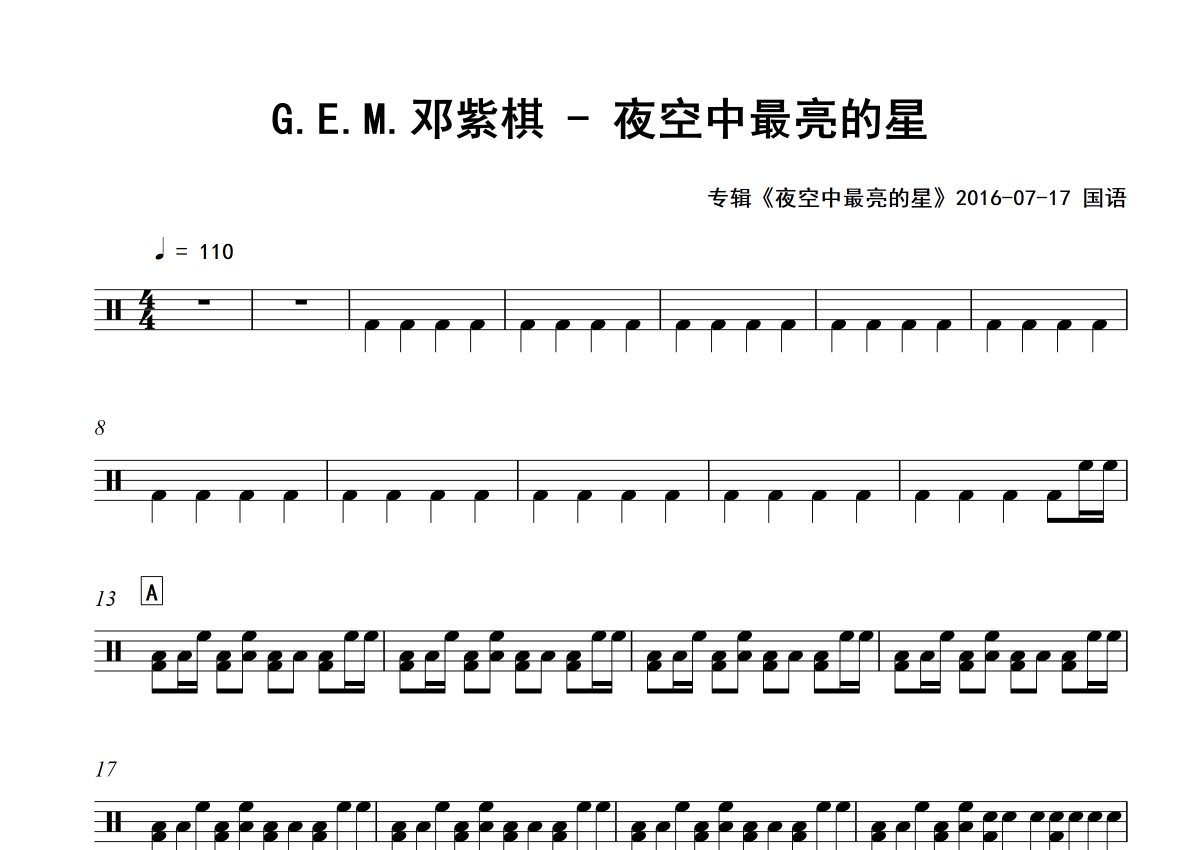 G.E.M.邓紫棋《夜空中最亮的星》架子鼓谱 - 专辑版