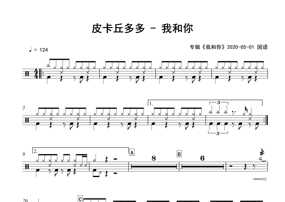 皮卡丘多多《我和你》架子鼓谱 - 专辑版