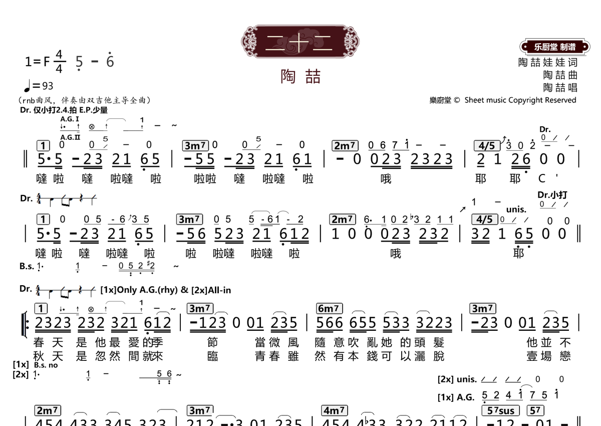 “乐厨堂”乐谱发布小组: 出版级乐谱扒谱制谱——以职业乐手圈通行标准记谱,遵循原版和声、伴奏元素和段落结构。 ❶ 2.0多功能专业团谱:采用台湾卓著公司开创的二代简谱标准制作。二代简谱无疑是迄今为止最科学、最易读的专业范畴多功能记谱方案:❷ 框架谱:采用职业乐手通常记谱方案制作。