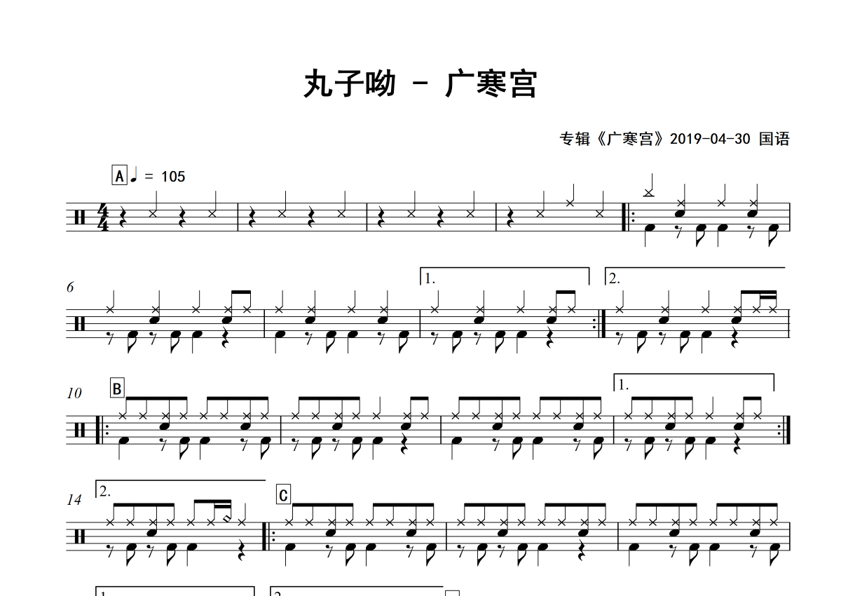 《广寒宫》是丸子哟演唱的一首歌曲,专辑版,拍号为4/4拍,歌曲速度为每分钟105拍,这份架子鼓谱共有两张高清图谱,图谱由 @Sawubona 编配上传,图谱使用五线谱编配,使用这份广寒宫架子鼓谱,你将能够轻松地敲打出这首丸子哟的广寒宫,快来尝试吧。