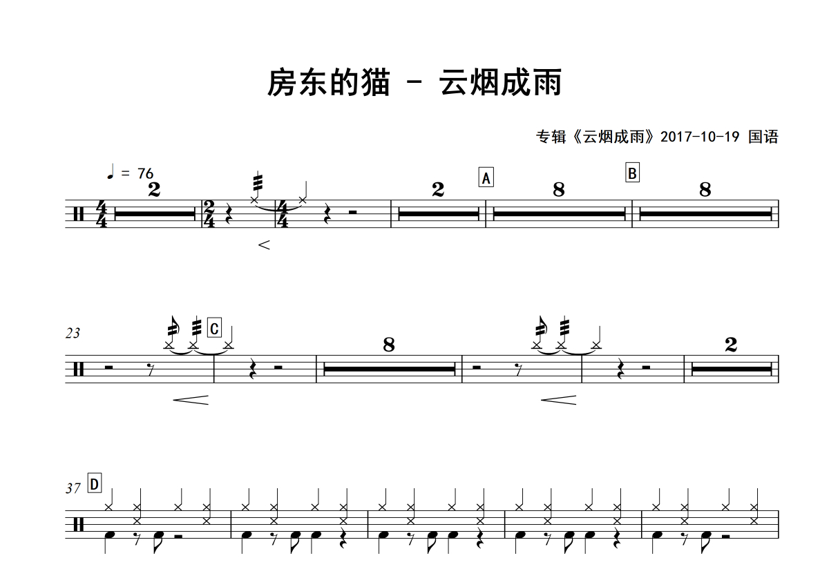 《云烟成雨》是房东的猫演唱的一首歌曲,专辑版,拍号为4/4拍,歌曲速度为每分钟76拍,这份架子鼓谱共有两张高清图谱,图谱由 @Sawubona 编配上传,图谱使用五线谱编配,使用这份云烟成雨架子鼓谱,你将能够轻松地敲打出这首房东的猫的云烟成雨,快来尝试吧。