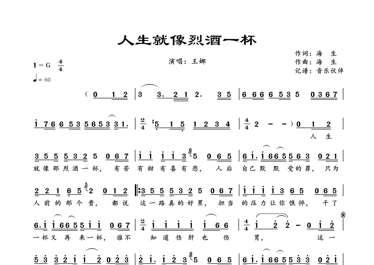 《人生就像烈酒一杯》是王娜演唱的一首歌曲,拍号为4/4拍,歌曲速度为每分钟60拍,这份简谱共有一张高清图谱,图谱由 @音乐伙伴 编配上传。