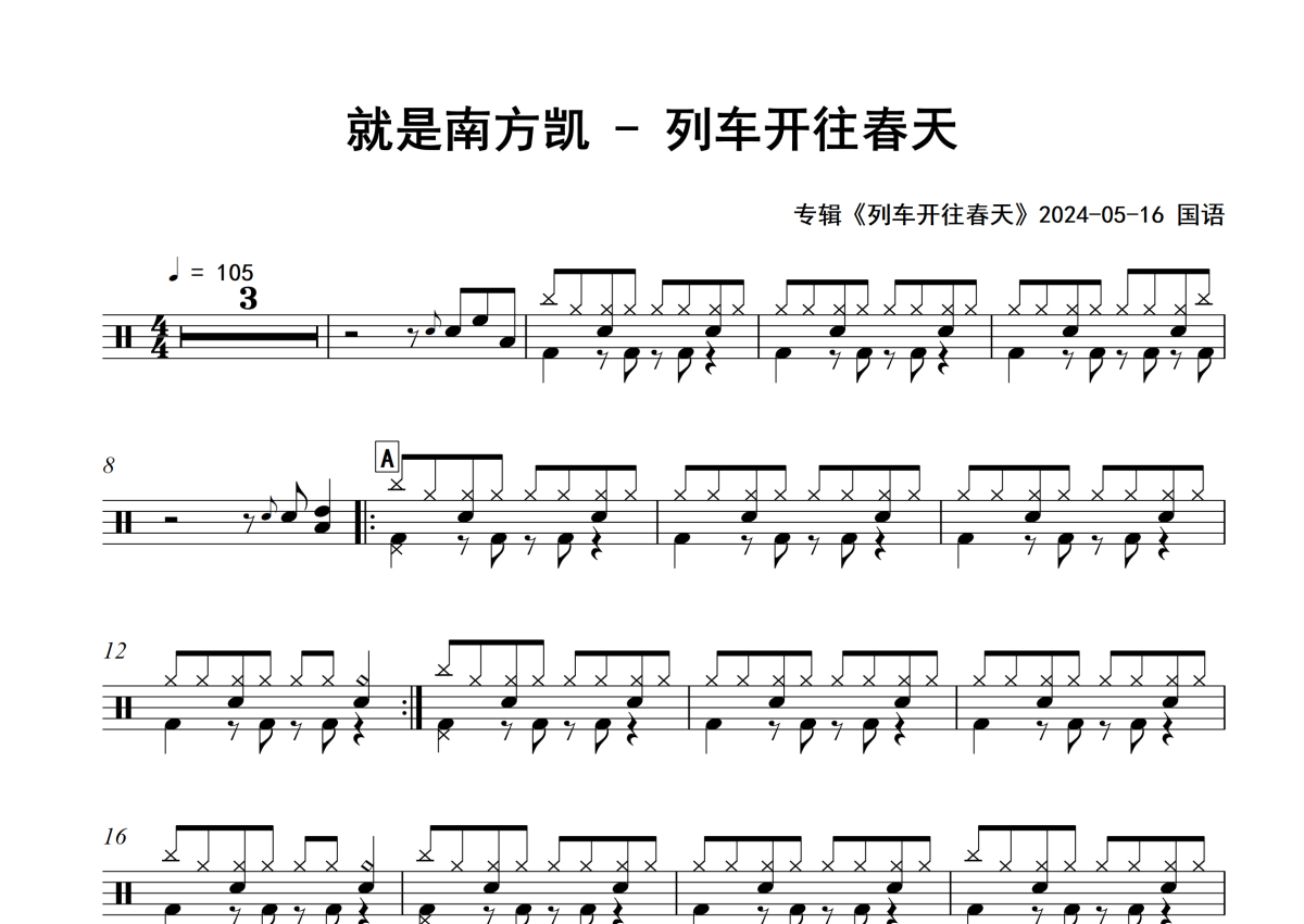 就是南方凯《列车开往春天》架子鼓谱 - 专辑版