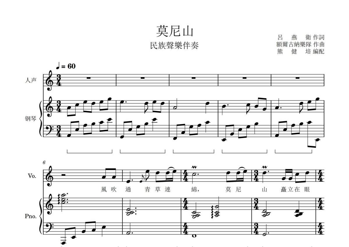 《莫尼山》是额尔古纳乐队演唱的一首歌曲,声乐即兴伴奏完美版,拍号为4/4拍,歌曲速度为每分钟60拍,这份钢琴谱共有六张高清图谱,图谱由 @琴魂用户_220749 编配上传,曲谱配备了相关的音频提供试听,使用这份莫尼山钢琴谱,可以让你更加方便地掌握这首歌曲的弹唱技巧,快来尝试吧。莫尼山 即兴伴奏完整编配版,由本人精心选择好听的和弦与编配合适的织体,在原曲的基础上进行了适当的改编,改编后具有很强的邓垚老师钢琴伴奏风格,此谱子难度较高,主要体现在全曲贯穿的节奏变化(四三拍与四四拍交替)以及间奏转调,练习熟练后可代替民族声乐正谱伴奏进行使用。 曲谱带有旋律和歌词,试听音频为不带旋律的纯伴奏,觉得好听再考虑购买。