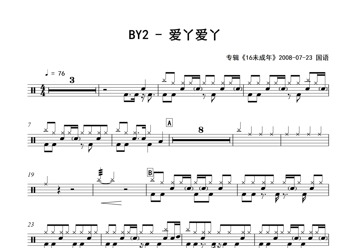 BY2《爱丫爱丫》架子鼓谱 - 专辑版