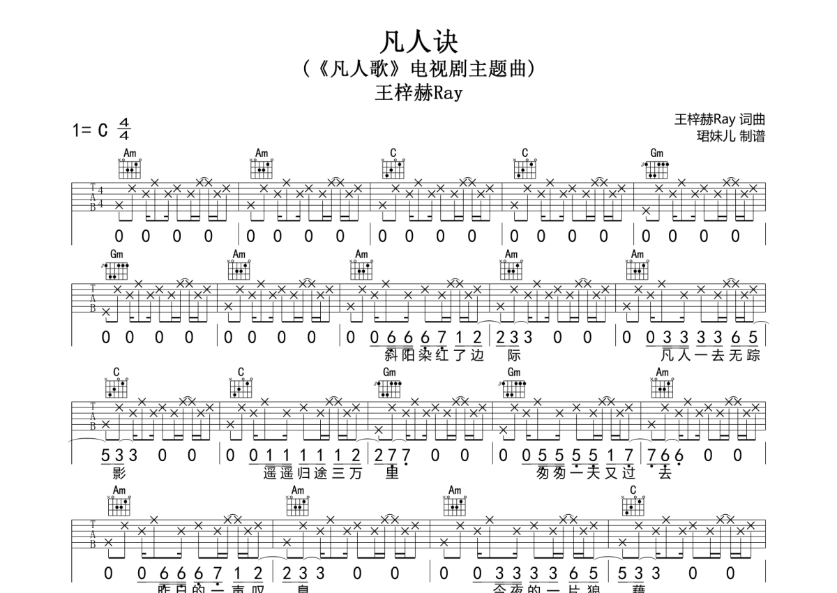王梓赫Ray《凡人诀》吉他谱 - C调弹唱六线谱