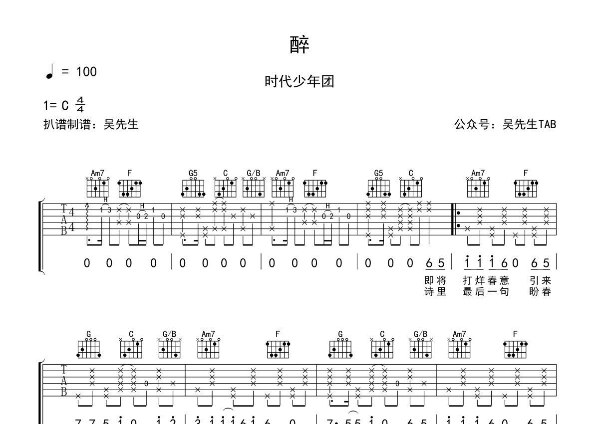 时代少年团《醉》吉他谱 - C调弹唱六线谱