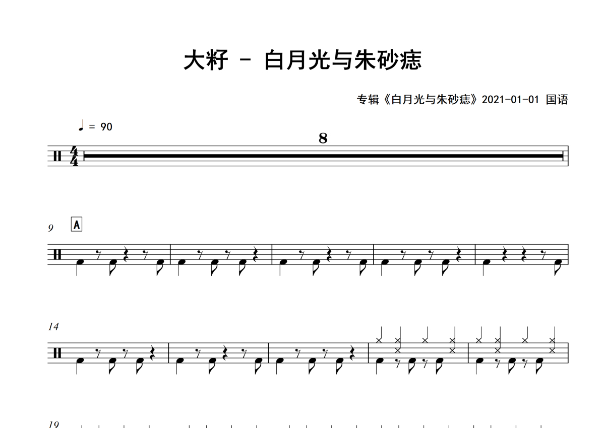 《白月光与朱砂痣》是大籽演唱的一首歌曲,专辑版,拍号为4/4拍,歌曲速度为每分钟90拍,这份架子鼓谱共有两张高清图谱,图谱由 @Sawubona 编配上传,图谱使用五线谱编配,使用这份白月光与朱砂痣架子鼓谱,你将能够轻松地敲打出这首大籽的白月光与朱砂痣,快来尝试吧。