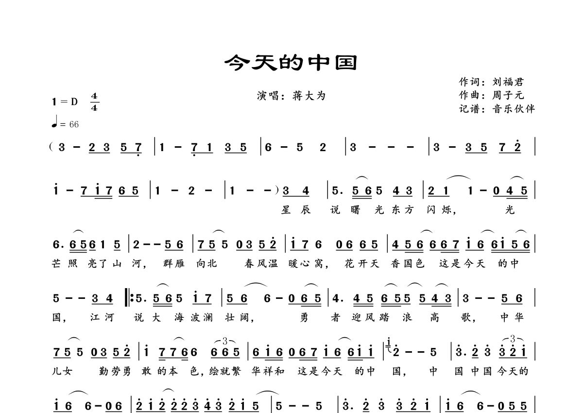 《今天的中国》是蒋大为演唱的一首歌曲,拍号为4/4拍,歌曲速度为每分钟66拍,这份简谱共有一张高清图谱,图谱由 @音乐伙伴 编配上传。