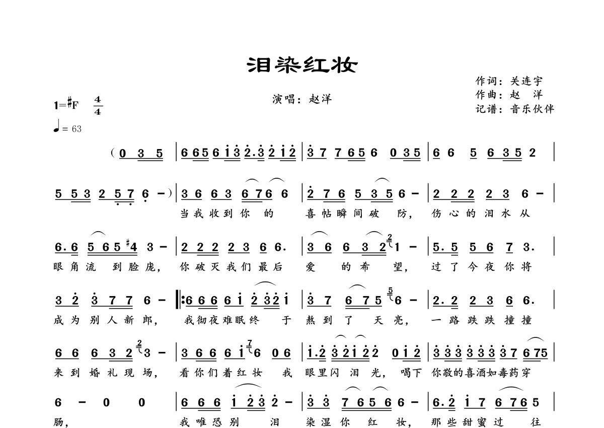 《泪染红妆》是赵洋演唱的一首歌曲,拍号为4/4拍,歌曲速度为每分钟63拍,这份简谱共有一张高清图谱,图谱由 @音乐伙伴 编配上传。