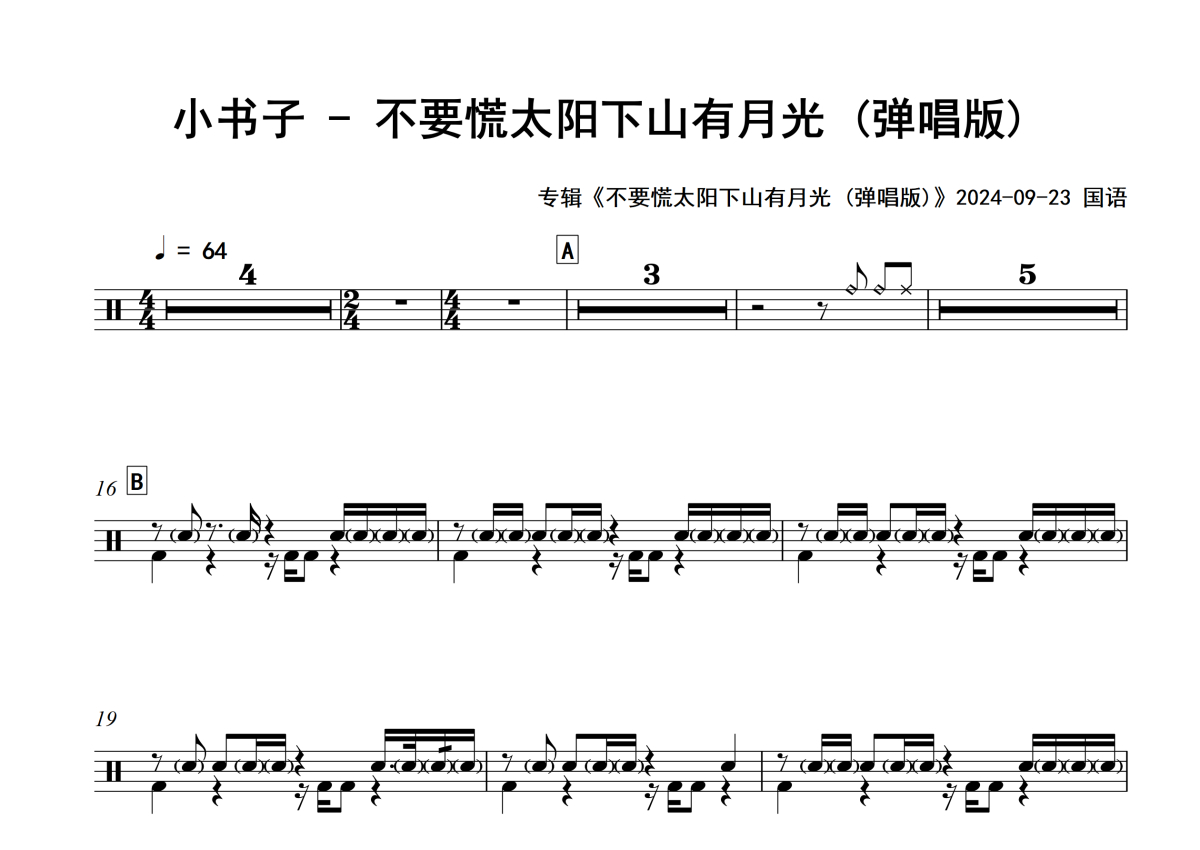 《不要慌太阳下山有月光》是小书子演唱的一首歌曲,(弹唱版)专辑版,拍号为4/4拍,歌曲速度为每分钟64拍,这份架子鼓谱共有两张高清图谱,图谱由 @举个例子 编配上传,图谱使用五线谱编配,使用这份不要慌太阳下山有月光架子鼓谱,你将能够轻松地敲打出这首小书子的不要慌太阳下山有月光,快来尝试吧。