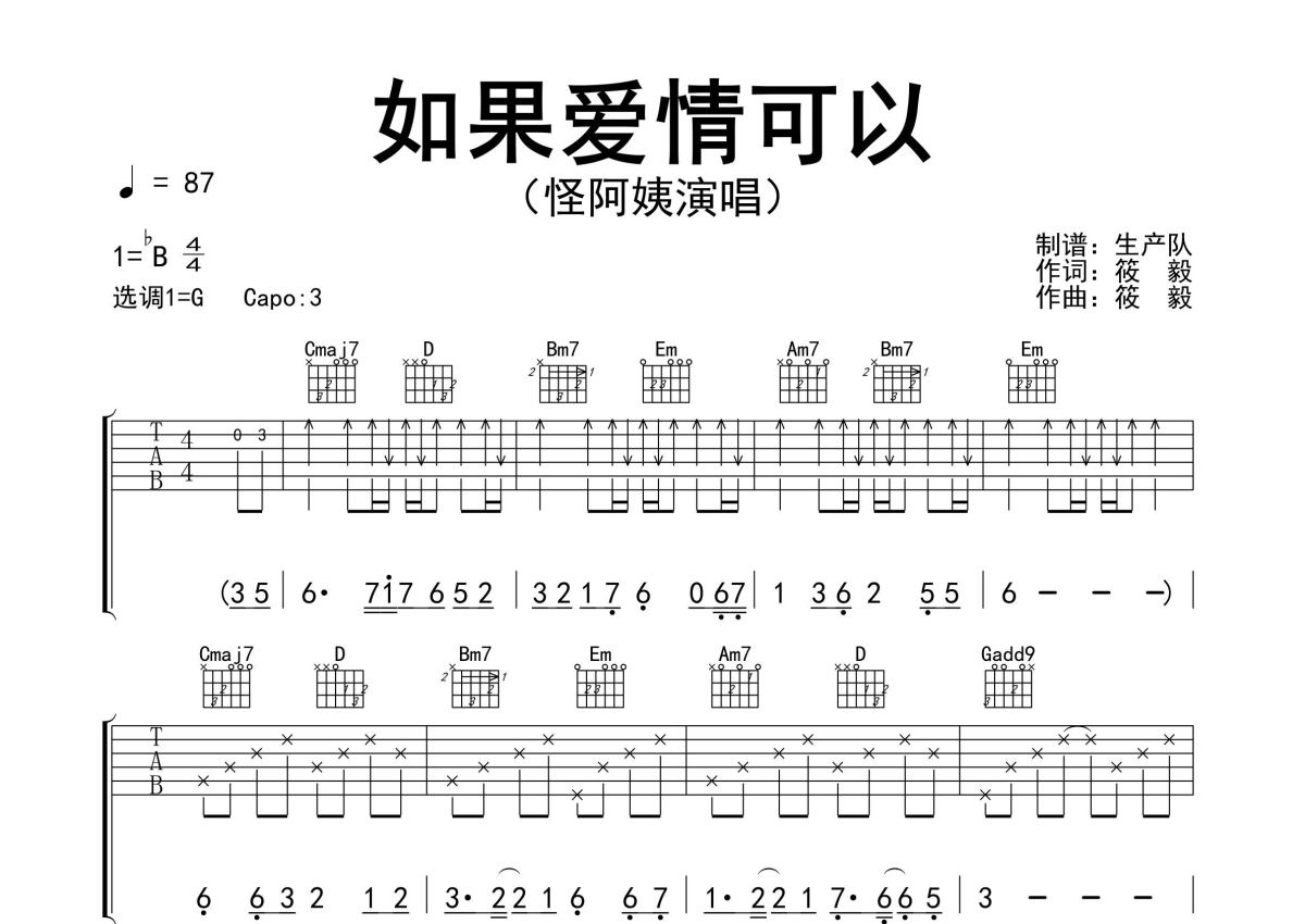 《如果爱情可以》是怪阿姨演唱的一首歌曲,精编民谣版,拍号为4/4拍,歌曲速度为每分钟87拍,歌曲原调为Bb调,但由于原调指法比较难,为了方便弹奏,本吉他谱采用的是G调指法编配,变调夹3品弹奏即为原调,当然也可以根据自己的音域改变变调夹位置,或者通过改变和弦调性,以方便自己弹奏,这份吉他谱共有三张高清图谱,图谱由 @生产队 编配上传,图谱使用六线谱编配,包含吉他和弦指法、简谱以及歌词部分,使用这份如果爱情可以吉他谱,可以让你更加方便地掌握这首歌曲的弹唱技巧,快来尝试吧。怪阿姨演唱的民谣歌曲《如果爱情可以》原版吉他谱,精准的前奏、间奏、尾奏solo编配。
