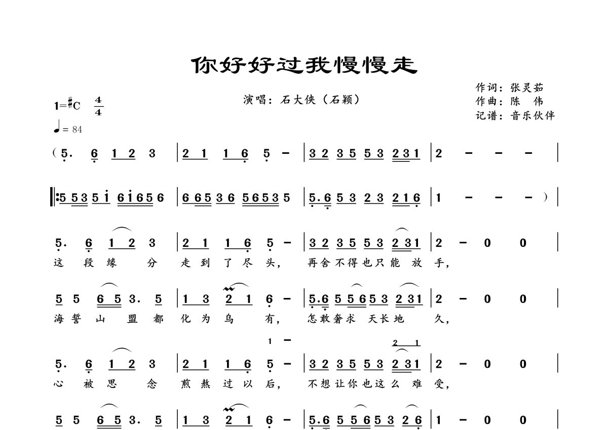 《你好好过我慢慢走》是石大侠(石颖)演唱的一首歌曲,拍号为4/4拍,歌曲速度为每分钟84拍,这份简谱共有一张高清图谱,图谱由 @音乐伙伴 编配上传。