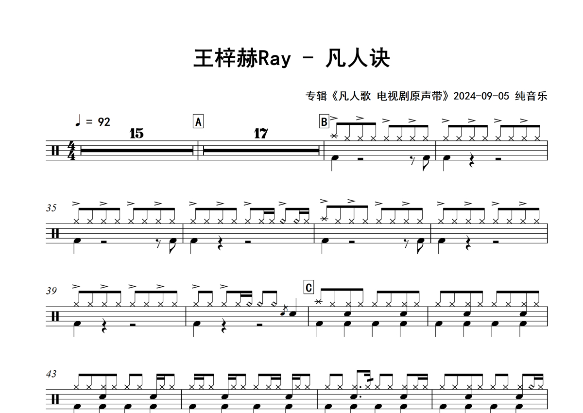 《凡人诀》是王梓赫Ray演唱的一首歌曲,专辑版,拍号为4/4拍,歌曲速度为每分钟92拍,这份架子鼓谱共有三张高清图谱,图谱由 @Sawubona 编配上传,图谱使用五线谱编配,使用这份凡人诀架子鼓谱,你将能够轻松地敲打出这首王梓赫Ray的凡人诀,快来尝试吧。
