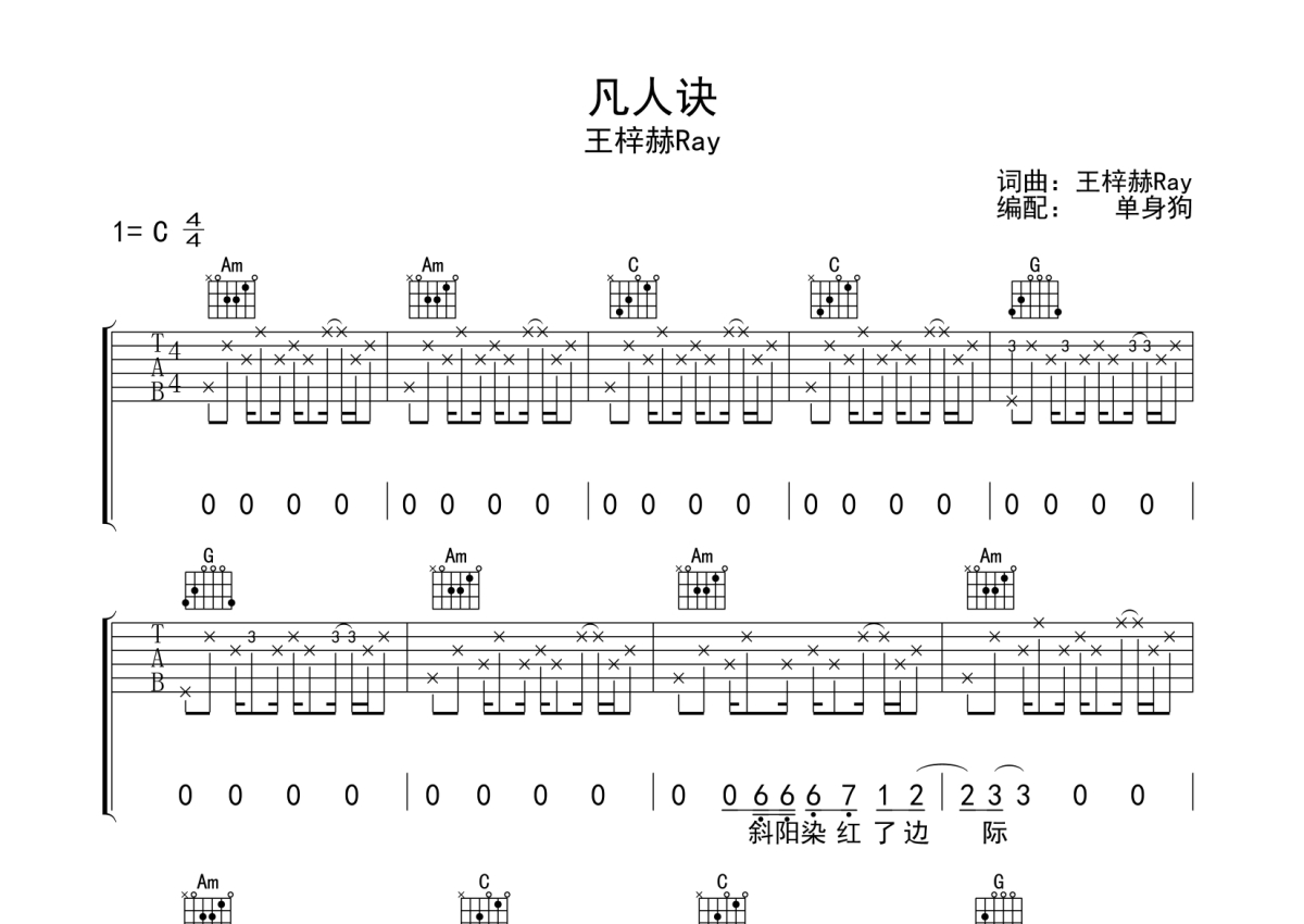 凡人诀吉他谱 - 王梓赫Ray演唱 - C调弹唱六线谱