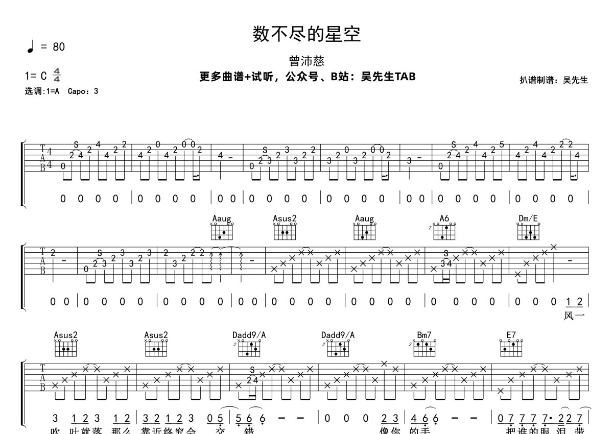 《数不尽的星空》是曾沛慈演唱的一首歌曲,本吉他谱采用的是A调指法编配,这份吉他谱共有两张高清图谱,图谱由 @吴先生TAB 编配上传,图谱使用六线谱编配,包含吉他和弦指法、简谱以及歌词部分,曲谱配备了相关的音频提供试听,使用这份数不尽的星空吉他谱,可以让你更加方便地掌握这首歌曲的弹唱技巧,快来尝试吧。曾沛慈《数不尽的星空》吉他弹唱谱,采用A调指法编配,吴先生TAB编配出品,共有2张高清图谱,免翻页排版设计。